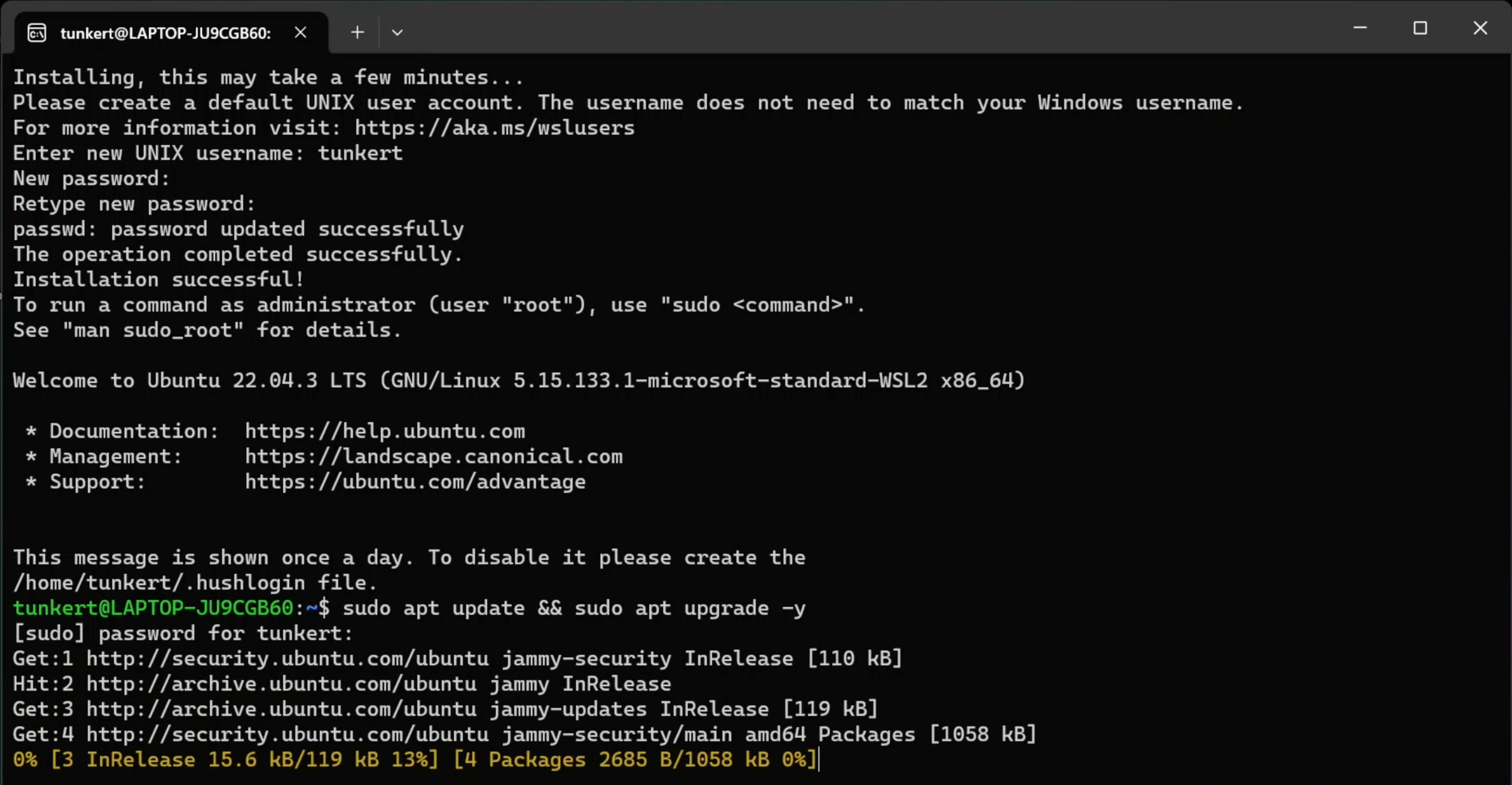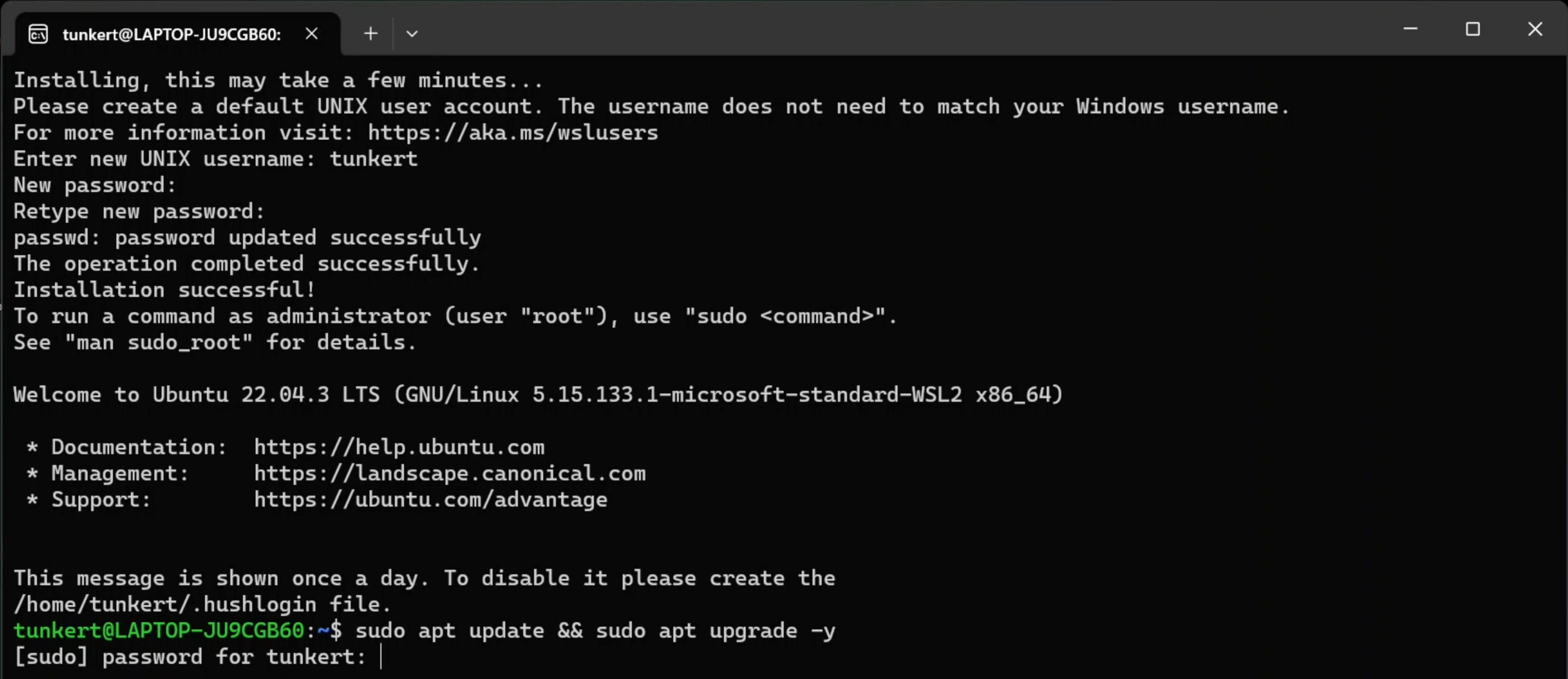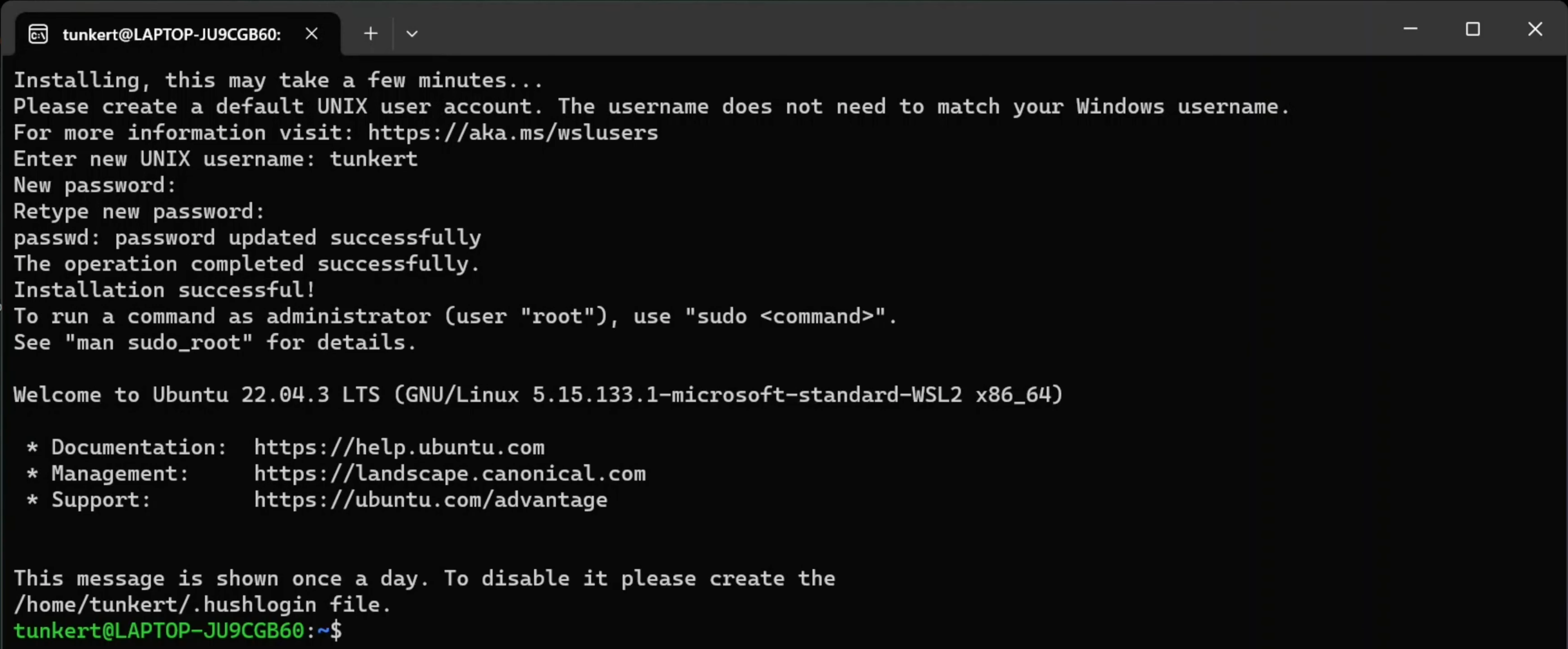 The typing line takes the new form of tunkert@LAPTOP-JU9CGB60:~$. Can you guess what the name after @ means? We will talk about what each symbol means in the terminal section.